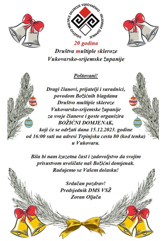 Društvo multiple skleroze Vukovarsko-srijemske županije obilježiti će Božićne i Novogodišnje blagdane uz druženje članova i gostiju društva uz prigodni Božićni domjenak u Vukovaru ulica Trpinjska cesta 80, u petak 15.12.2023 godine sa početkom od 16,00 sati.