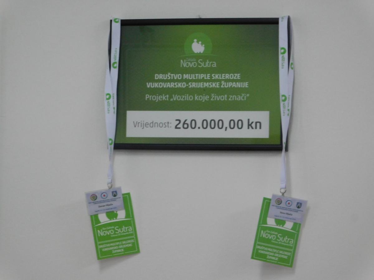 Dana 27.06.2019 godine od strane zaklade Novo Sutra u prostorijama Društva multiple skleroze Vukovarsko-srijemske županije upravitelj zaklade Davor Relatić službeno je predano prilagođeno putničko kombi vozilo za prijevoz osoba s invaliditetom za potrebe Društva multiple skleroze Vukovarsko-srijemske županije donirano od strane zaklade, vrijednost donacije je 260.000,00 kuna. Na navedenoj primopredaji vozila prisustvovali su Savez društava multiple skleroze Hrvatske izvršna direktorica gospođa Dijana Roginić, dopredsjednica zajednice Saveza osoba s invaliditetom gospođa Marica Mirić, specijalist neurologije doktorica Tea Mirošević-Zubonja,zamjenik gradonačelnika Grada Vukovara gospodin Marijan Pavliček, pročelnik Upravnog odjela Vukovarsko-srijemske županije gospodin Darko Dimić, predsjednica Društva multiple skleroze Krapinsko-zagorske županije gospođa Nada Smrekar te Predsjedništvo Društva multiple skleroze Vukovarsko-srijemske županije.